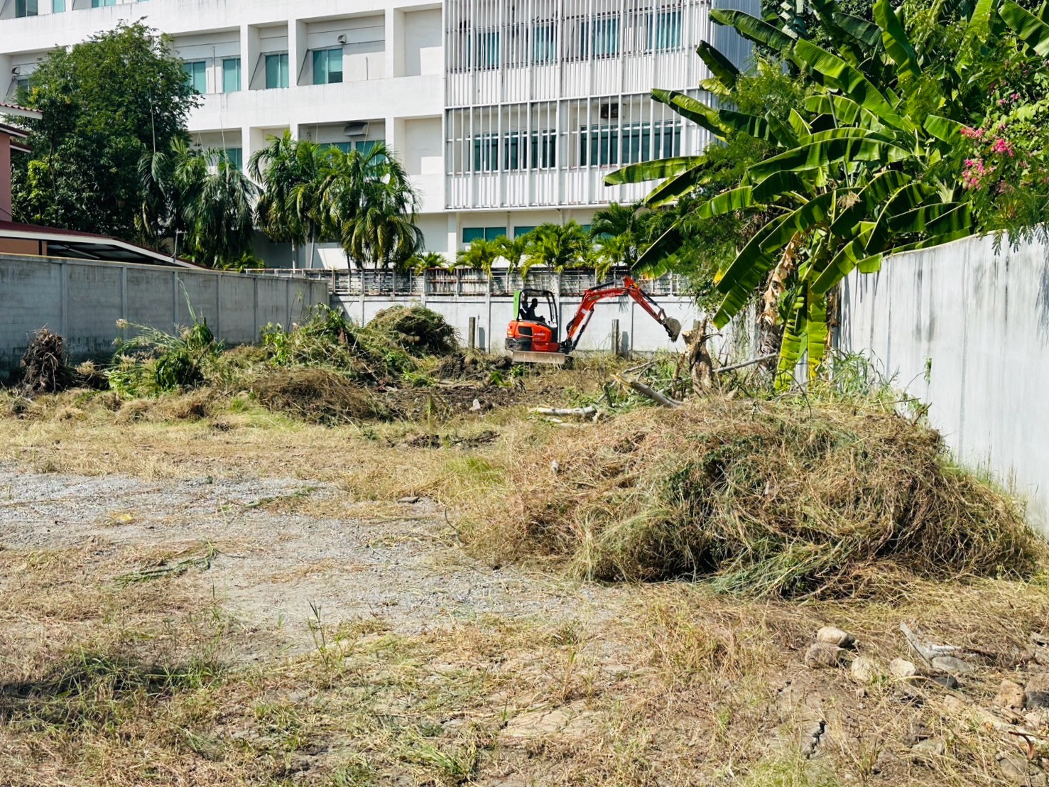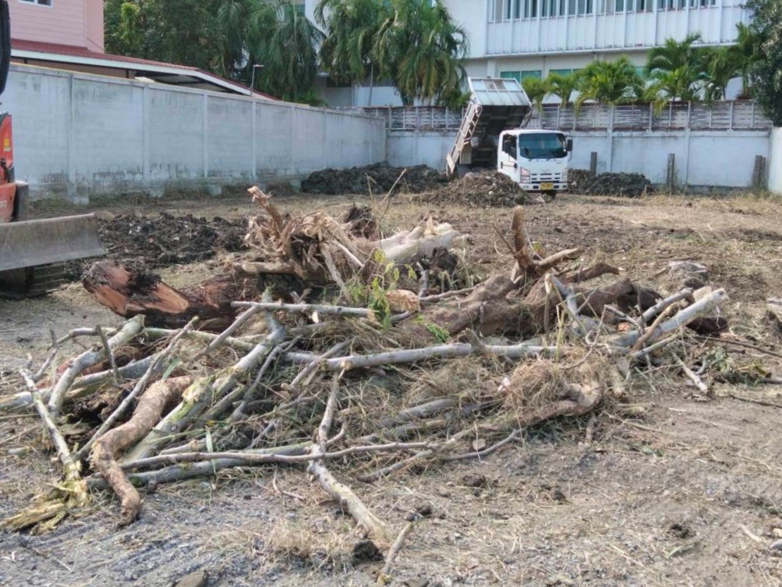 สภาพเดิมก่อนเริ่มงาน พื้นที่ 200 ตารางวาเต็มไปด้วยวัชพืช ต้นไม้ขึ้นรกสูง และเศษวัสดุต่างๆ ซึ่งเป็นอุปสรรคต่อการก่อสร้างและเป็นแหล่งสะสมของสัตว์เลื้อยคลาน ทีมงานของเราเริ่มต้นด้วยการนำเครื่องจักรเข้า “เคลียร์ริ่ง” ถางป่า ขุดรากถอนโคนต้นไม้ใหญ่ และขนย้ายเศษวัชพืชออกจากพื้นที่ เพื่อเปิดหน้าดินให้โล่งเตียนเตรียมพร้อมสำหรับการถมดิน